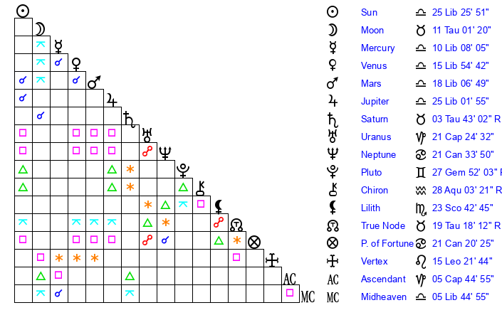 | Sun | 25 Libra 26 | 26 Libra 34 | 21 Aquarius 52 |