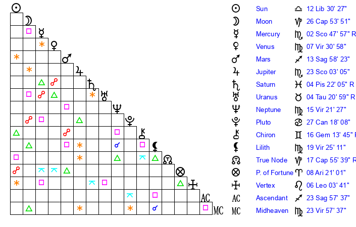 | Sun | 12 Libra 30 | 13 Libra 41 | 13 Capricorn 10 |