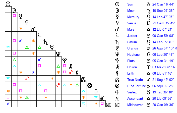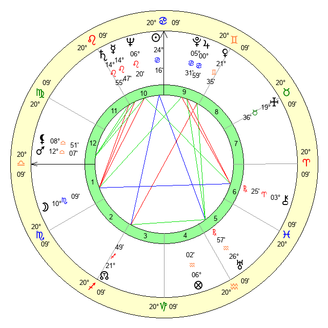 | Sun | 24 Cancer 16 | 25 Cancer 22 | 8 Scorpio 28 |
