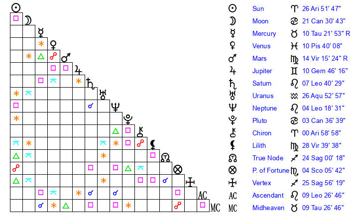 | Sun | 26 Aries 52 | 27 Aries 56 | 9 Leo 33 |