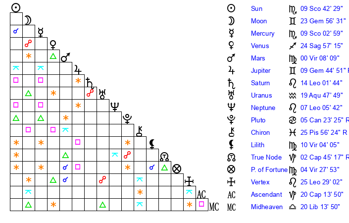| Moon | 23 Gemini 56 | 0 Aries 52 | 7 Gemini 30 |