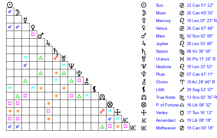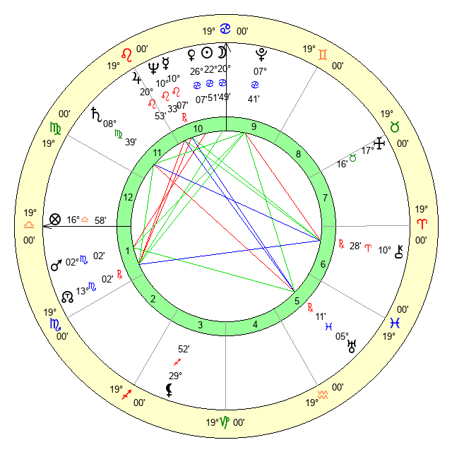 | Sun | 22 Cancer 51 | 23 Cancer 27 | 4 Scorpio 58 |