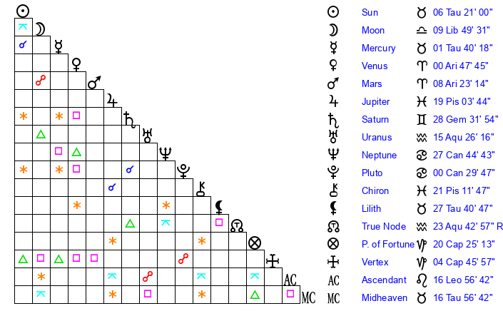 | Moon | 9 Libra 54 | 6 Taurus 15 | 20 Libra 34 |