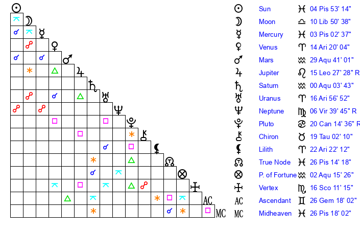 | Moon | 10 Libra 42 | 22 Capricorn 44 | 11 Pisces 54 |