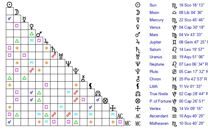 | Sun | 18 Scorpio 18 | 19 Scorpio 21 | 6 Pisces 51 |