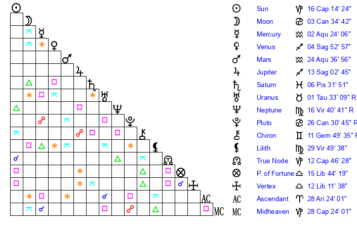 | Pluto | 26 Cancer 30 | 2 Aquarius 55 | 25 Cancer 9 |