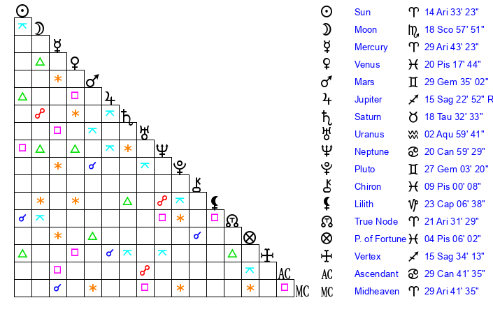 Mercury | 29 Aries 43 | 27 Pisces 10 | 0 Virgo 20 |