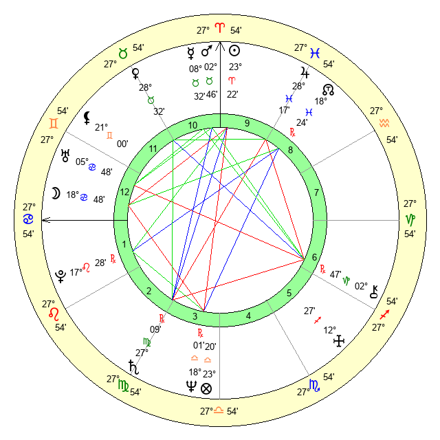 | Moon | 18 Cancer 41 | 6 Scorpio 23 | 14 Aries 51 |