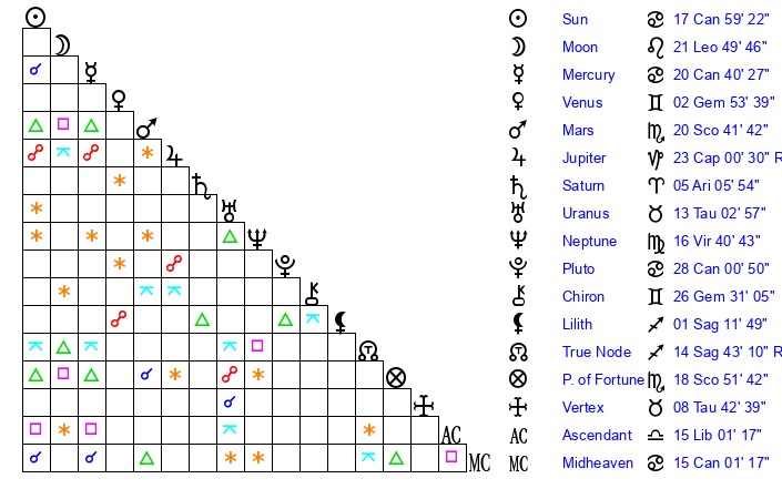 | Moon | 21 Leo 54 | 16 Capricorn 59 | 8 Scorpio 10 |