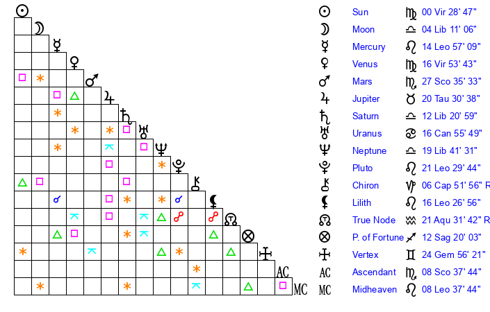 Sun | 0 Virgo 29 | 0 Virgo 49 | 12 Scorpio 13 |