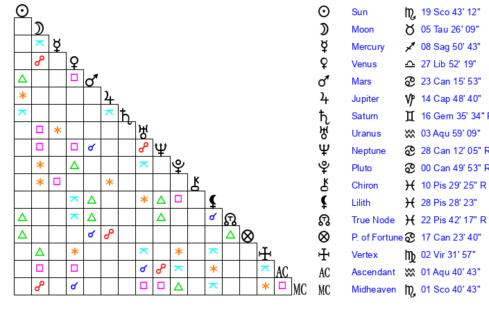 | Sun | 19 Scorpio 43 | 20 Scorpio 48 | 12 Pisces 17 |