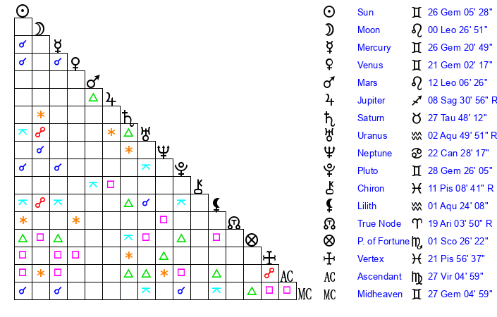 Sun | 26 Gemini 5 | 26 Gemini 45 | 15 Libra 2 |