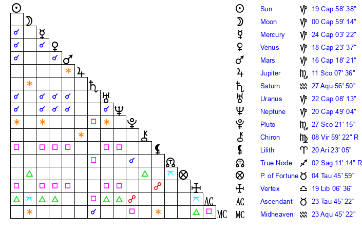 Venus | 18 Capricorn 23 | 7 Pisces 37 | 27 Aquarius 20 |