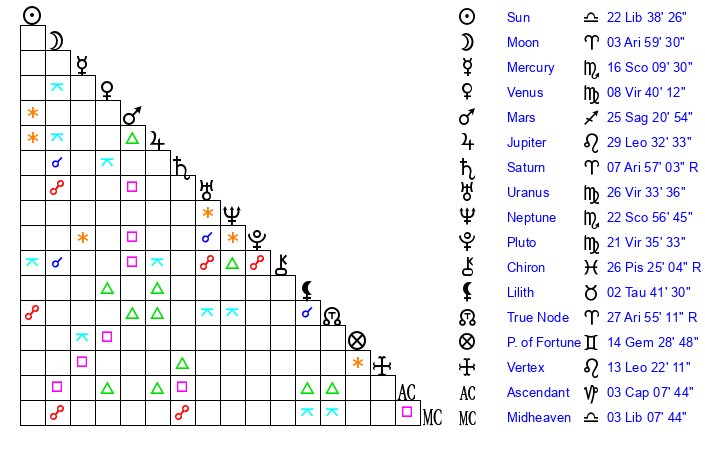 Sun | 22 Libra 38 | 23 Libra 49 | 19 Sagittarius 59 |