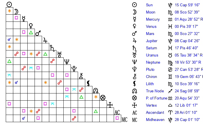 | Venus | 0 Pisces 39 | 16 Capricorn 23 | 4 Taurus 12 |