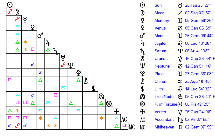 | Pluto | 23 Gemini 36 | 3 Aquarius 46 | 25 Gemini 48 |