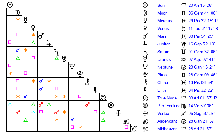 Pluto | 28 Gemini 10 | 3 Aquarius 40 | 0 Cancer 28 |