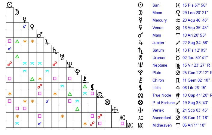 | Neptune | 15 Virgo 22 | 29 Pisces 6 | 14 Virgo 0 |