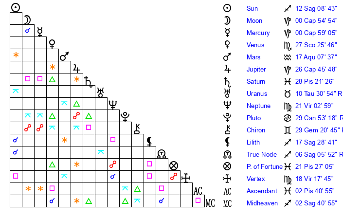 | Sun | 12 Sagittarius 8 | 12 Sagittarius 48 | 11 Pisces 28 |