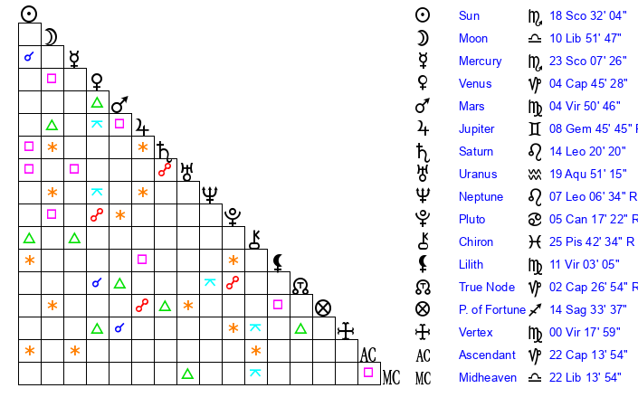 | Moon | 10 Libra 52 | 18 Pisces 59 | 13 Virgo 35 |