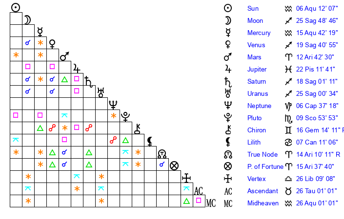 | Saturn | 18 Sagittarius 12 | 16 Pisces 47 | 20 Sagittarius 48 |