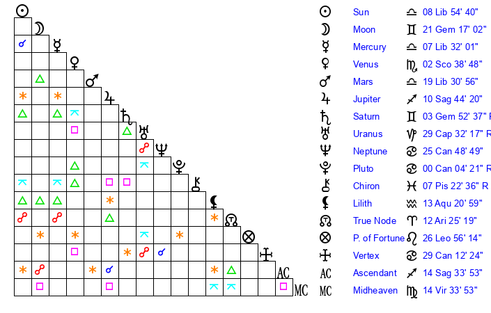 Sun | 8 Libra 55 | 9 Libra 33 | 2 Aquarius 54 |