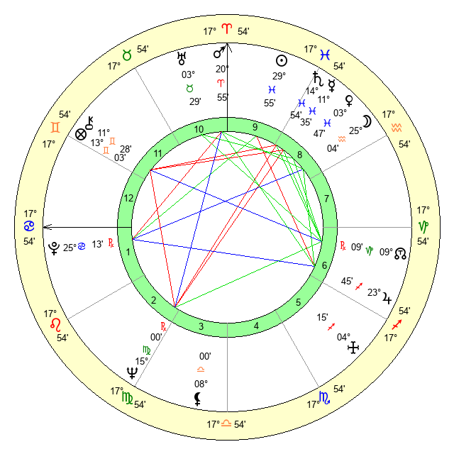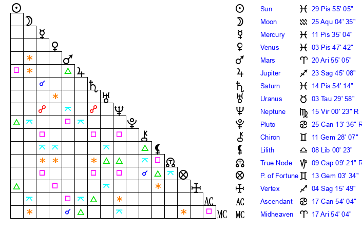 | Sun | 29 Pisces 54 | 0 Aries 20 | 26 Gemini 17 |