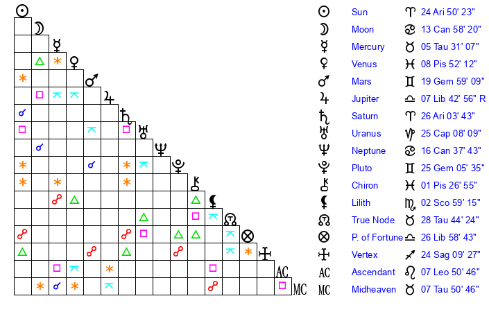 | Sun | 24 Aries 50 | 25 Aries 58 | 15 Leo 14 |