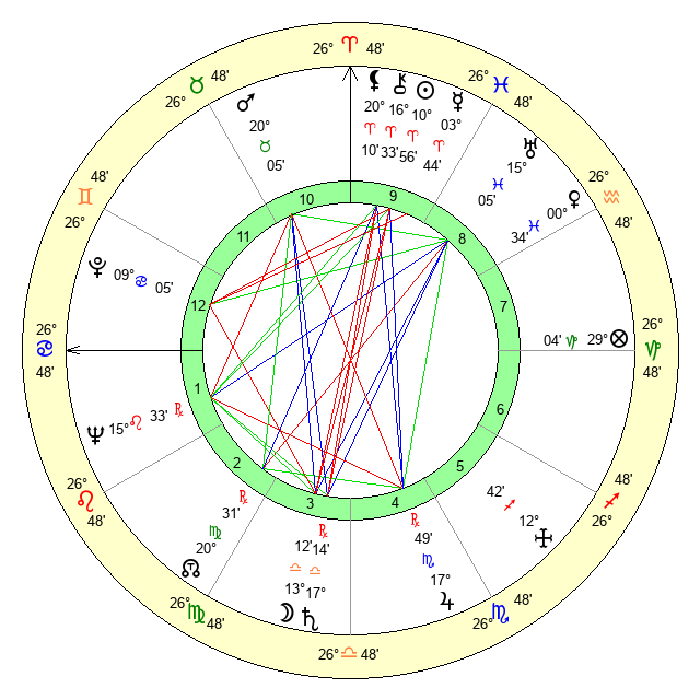 | Sun | 10 Aries 57 | 12 Aries 13 | 19 Cancer 18 |