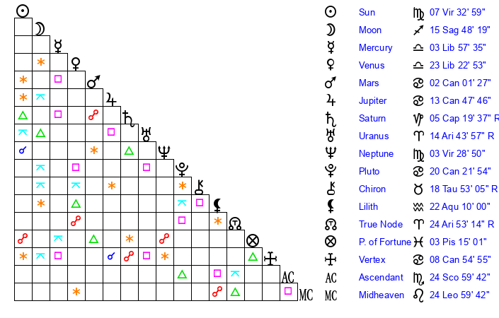 | Sun | 7 Virgo 33 | 8 Virgo 32 | 11 Sagittarius 50 |