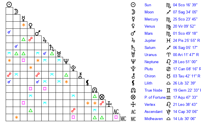 | Sun | 4 Scorpio 17 | 5 Scorpio 31 | 13 Aquarius 38 |
