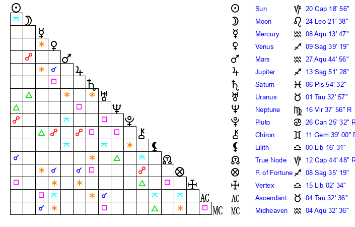 | Moon | 24 Leo 18 | 2 Scorpio 58 | 2 Sagittarius 0 |
