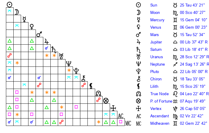 | Pluto | 22 Libra 5 | 3 Aquarius 46 | 21 Libra 32 |