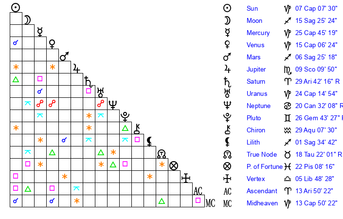 Pluto | 26 Gemini 43 | 0 Aquarius 59 | 26 Gemini 13 |
