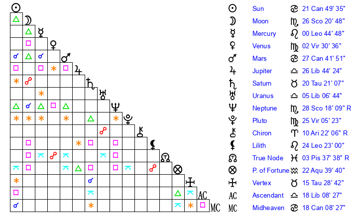 Mars | 27 Cancer 42 | 15 Virgo 49 | 2 Virgo 51 |