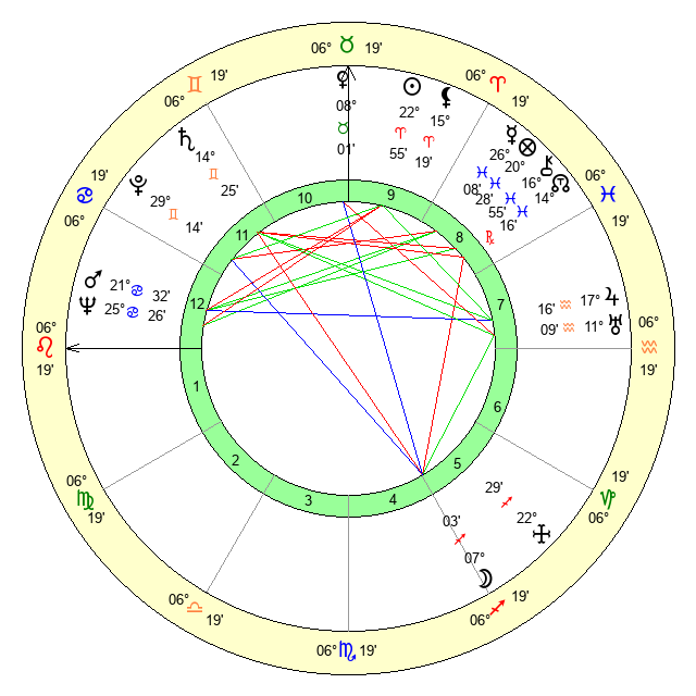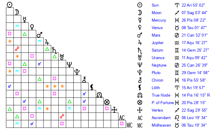 | Sun | 22 Aries 55 | 24 Aries 1 | 9 Leo 31 |