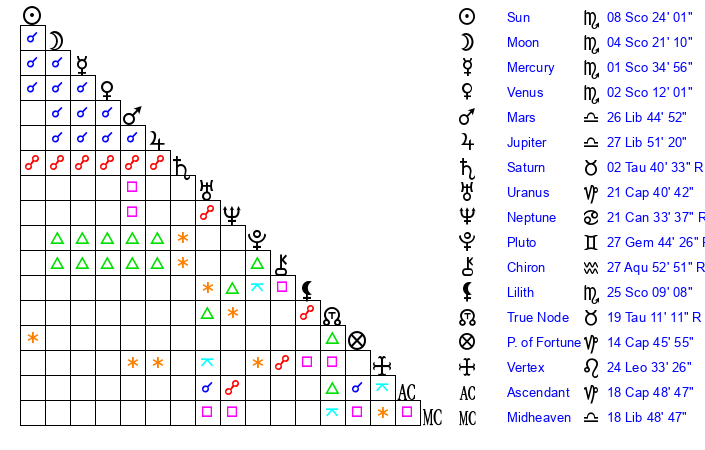 | Moon | 4 Scorpio 19 | 11 Scorpio 46 | 1 Capricorn 31 |