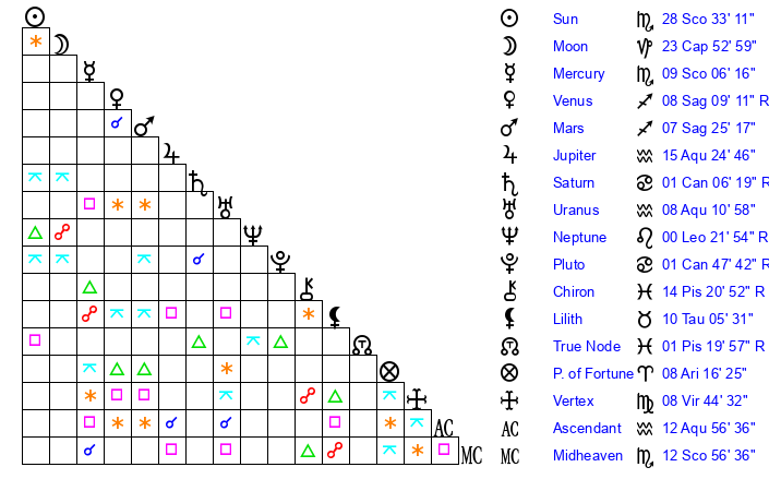 | Sun | 28 Scorpio 33 | 29 Scorpio 53 | 20 Pisces 3 |