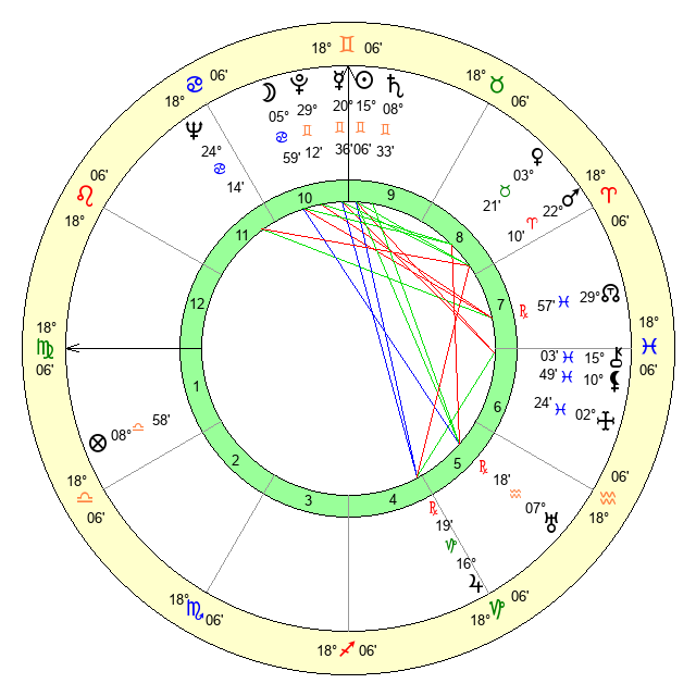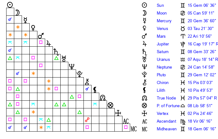 | Sun | 15 Gemini 6 | 16 Gemini 0 | 2 Libra 44 |