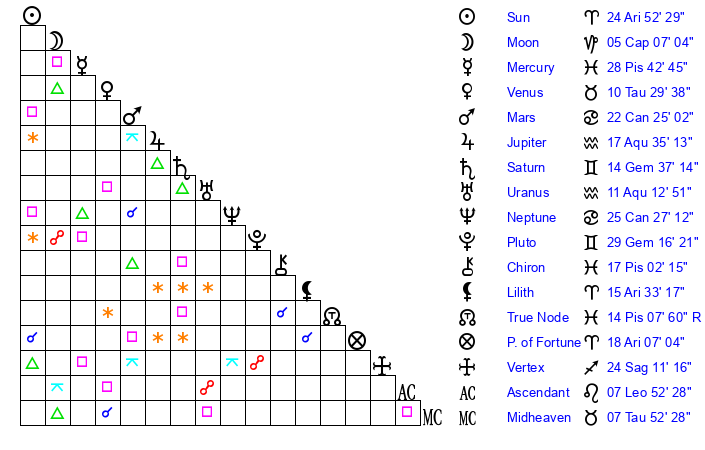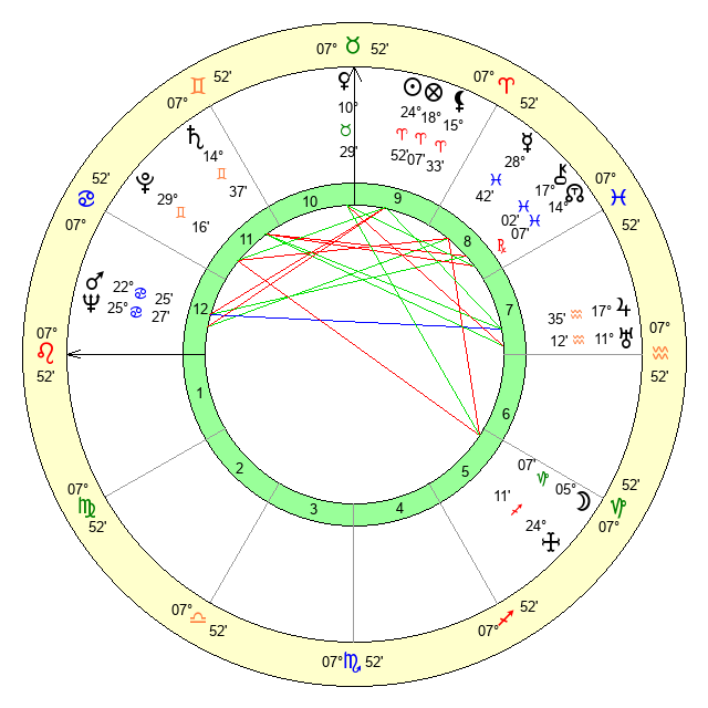| Sun | 24 Aries 52 | 25 Aries 58 | 11 Leo 26 |
