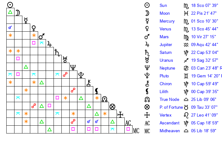 | Sun | 18 Scorpio 7 | 19 Scorpio 18 | 22 Pisces 42 |