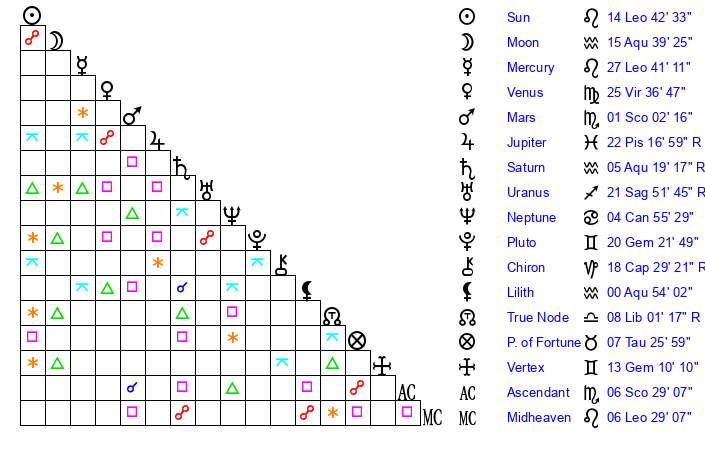 | Moon | 15 Aquarius 44 | 5 Aquarius 22 | 5 Leo 13 |