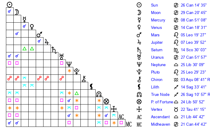 | Venus | 14 Cancer 18 | 16 Gemini 52 | 10 Libra 55 |