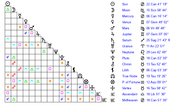 | Moon | 16 Scorpio 6 | 23 Pisces 19 | 11 Taurus 12 |