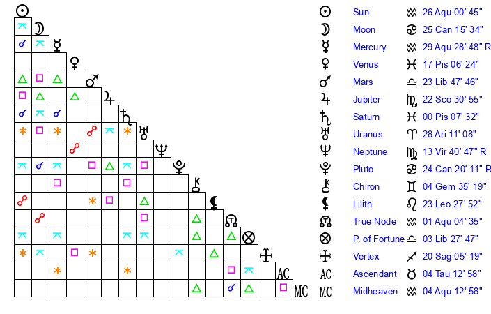 Sun | 26 Aquarius 0 | 27 Aquarius 11 | 24 Taurus 48 |