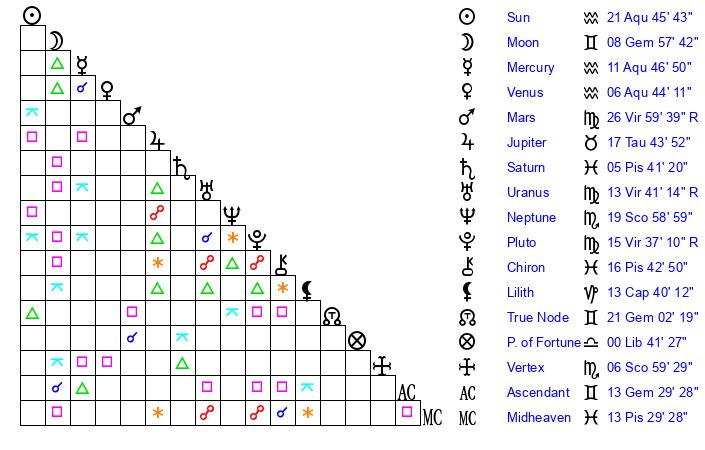 Pluto | 15 Virgo 37 | 2 Aquarius 21 | 14 Virgo 8 |