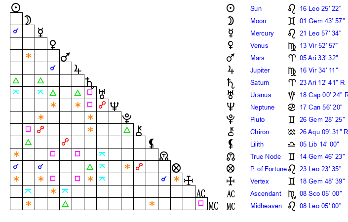 | Sun | 16 Leo 26 | 17 Leo 21 | 10 Sagittarius 55 |