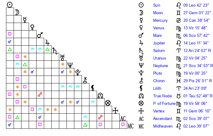 Moon | 26 Gemini 57 | 23 Scorpio 31 | 9 Leo 39 |