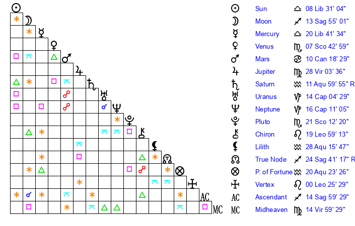 | Sun | 8 Libra 31 | 8 Libra 31 | 11 Scorpio 16 |