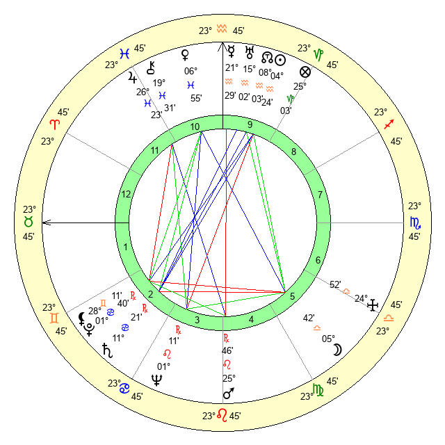 | Sun | 4 Aquarius 25 | 5 Aquarius 59 | 22 Taurus 34 |